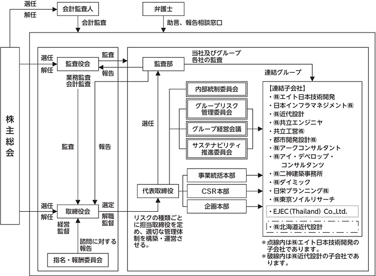 当社は、E・Jグループの持株会社として、「地球環境にやさしい優れた技術と判断力で真に豊かな社会創りに貢献」というグループ理念のもとで、グループ全体の企業価値の向上並びに株主に対する経営の透明性を高めるために必要なコーポレート・ガバナンスの実践を経営の最重要課題 一つとして位置づけております。