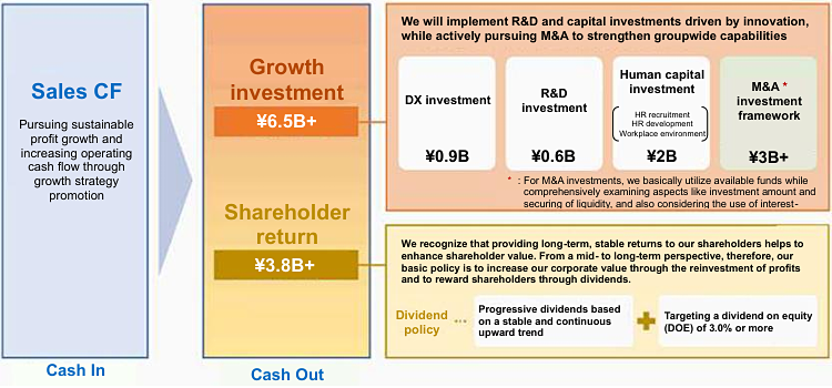 Based on a sound financial foundation, we will advance proactive growth investments and long-term stable shareholder returns to enhance our group corporate value.