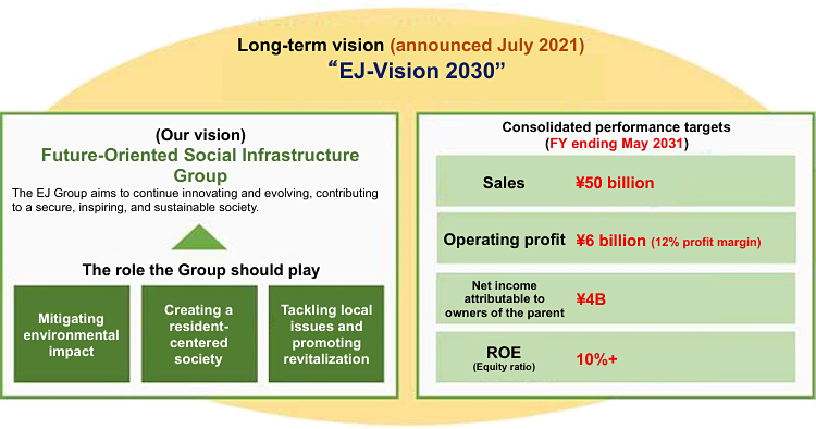 The targets set for the final year of the 6th Mid-Term Management Plan are at a level close to those in our long-term EJ-Vision 2030, announced in July 2021 (as noted above). We are also scrutinizing external factors such as rapid social changes (the accelerating decline of Japan’s population, and advances in AI technology), and plan to review our long-term vision, including possible adjustments to the timing of target achievement, and republish it accordingly.